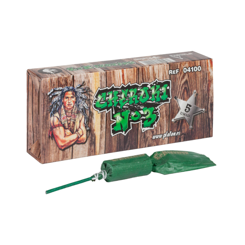 Cheroky Nº3 es un potente trueno pirotécnico que produce una fuerte explosión y viene en una caja con 64 unidades.