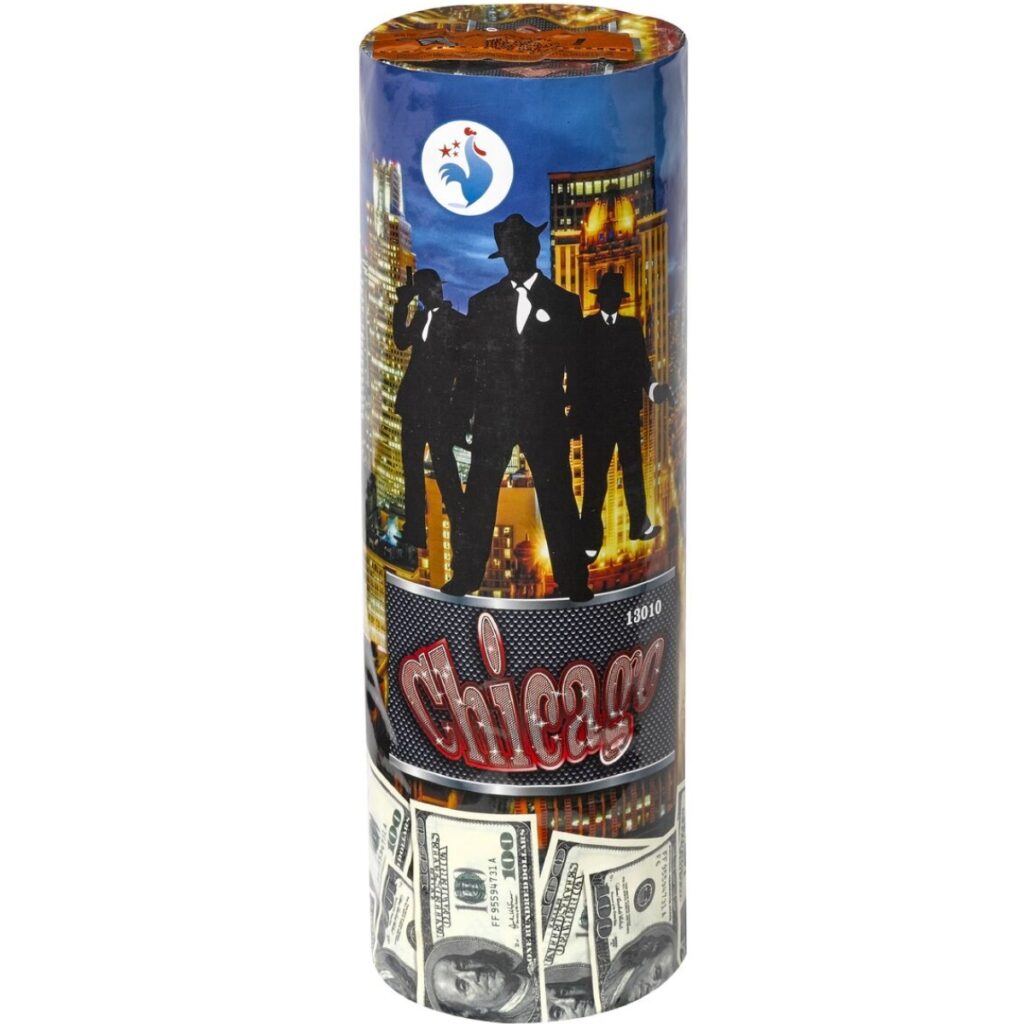 Combinación de azul, verde, rojo, cracker con crisantemos dorados y silbidos.