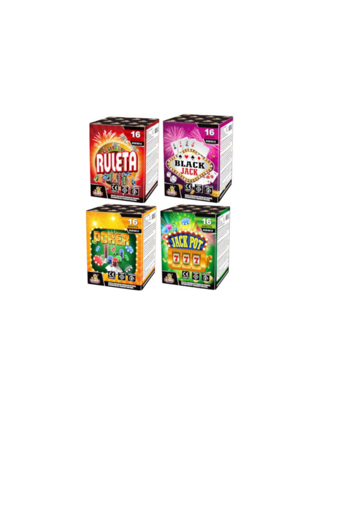 Surtido de baterías de molde de 16 disparos, de 16 mm de diámetro con diferentes y variados efectos, con una duración aproximada de unos 25 segundos. Contiene 4 modelos diferentes.